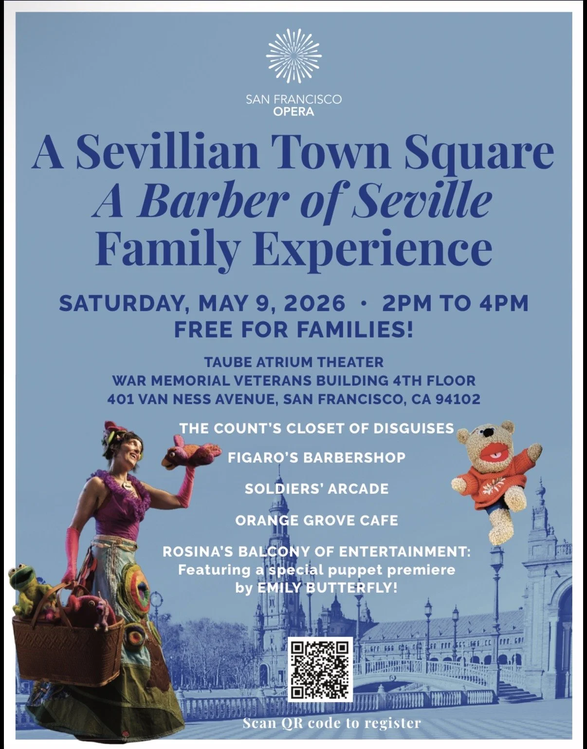 Join us on Saturday, May 9 and step into a lively Sevillian town square with San Francisco Opera’s Department of Engagement and Connectivity. Enjoy an immersive afternoon at this family-friendly experience inspired by The Barber of Seville. Wander through Figaro’s bustling barbershop, explore a closet of clever disguises, play classic games, and nibble on café treats beneath the orange trees. As the afternoon unfolds, gather for music, entertainment, and a whimsical puppet premiere by Edutainer Emily Butterfly.